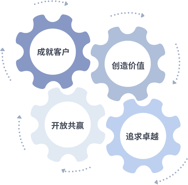 成就客户是一切决策的出发点,,,创造价值是衡量所有工作的标准,,,追求卓越是我们做事做人的态度,,,开放共赢是我们的格局也是最终的结果。。价值观的齿轮环环相扣,,,推动着组织里的每个人不断向前。。。
