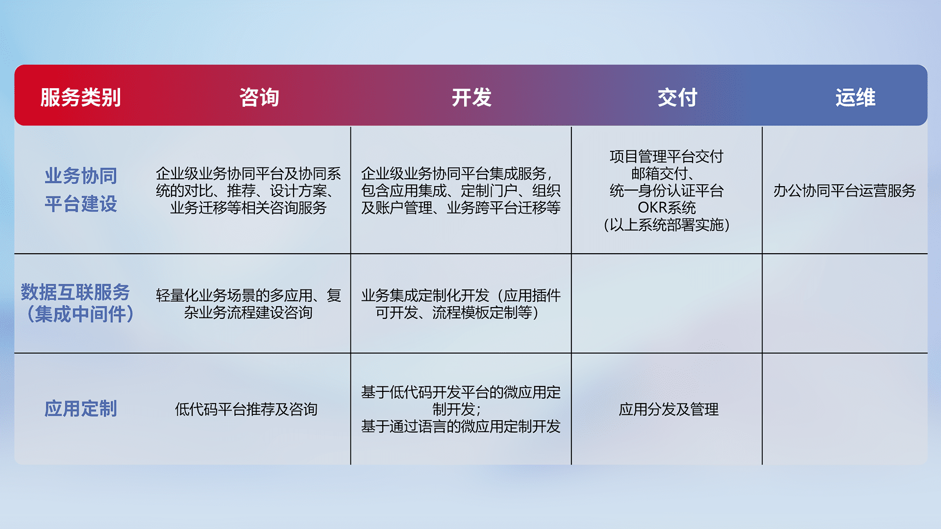 针对钉钉、、、企微、、、IDaas等平台级产品提供产品的规划、、方案、、、交付、、、定制化开发等服务,,实现如统一协同办公、、、智能客户服务、、混合会议管理、、智能数据查询、、等业务场景,,,实现数字化转型。。