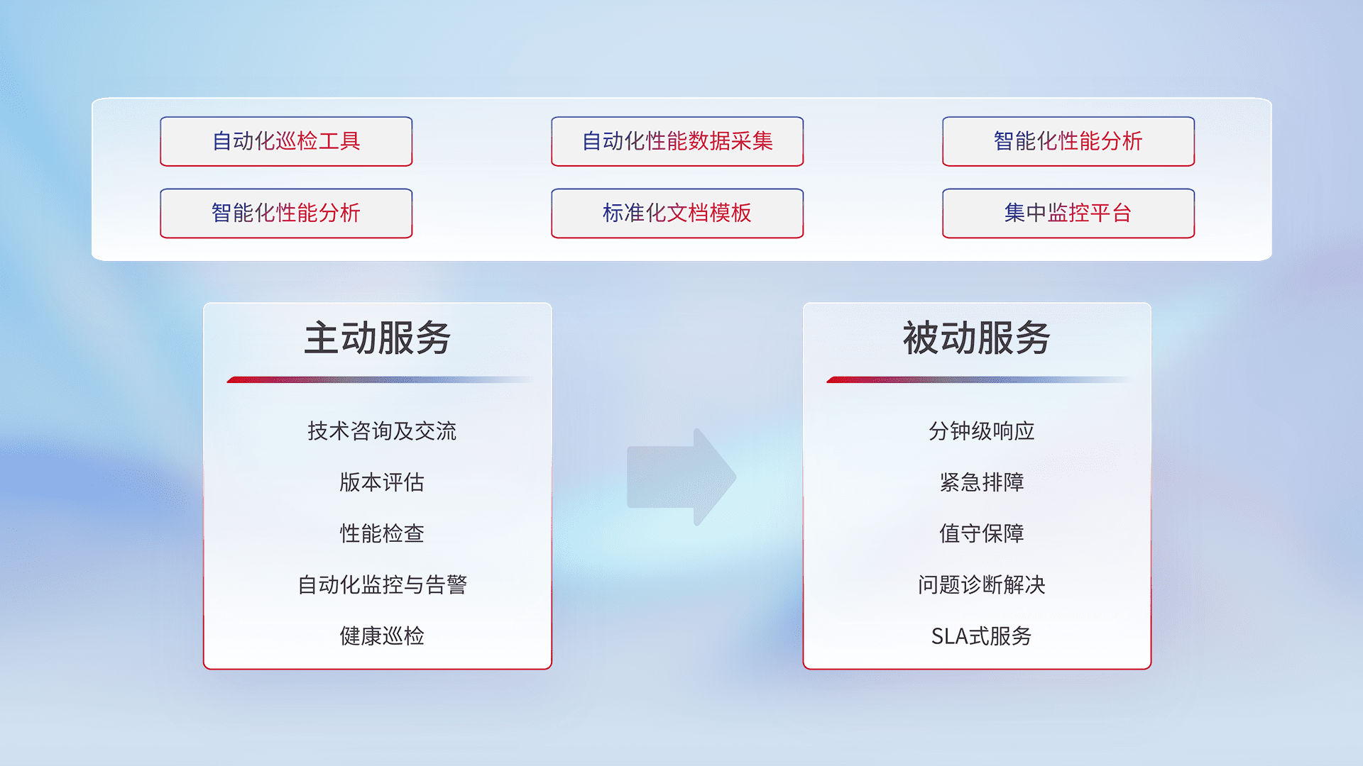 智能化工具和标准化文档,,,保障服务质量,,,,提供主动服务(包含技术咨询、、、版本评估、、、性能检查、、自动化监控与告警、、、、健康巡检)和被动服务包含(分钟级响应、、、紧急排障、、、、值守保障、、、、问题诊断解决、、SLA服务)。。。